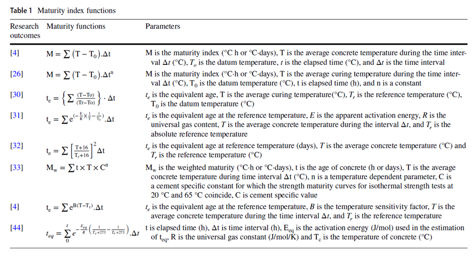 Maturity merupakan konsep yang sudah ada sejak tahun 1950-an. Sejak itu, berbagai persamaan telah diajukan untuk menghitung kematangan beton. Terdapat beberapa metode yang dapat digunakan untuk menghitung kematangan yaitu: faktor suhu-waktu, umur ekuivalen dan kematangan tertimbang. Semua metode maturity terutama tergantung pada riwayat temperatur beton, tetapi juga pada parameter tambahan yang berkaitan dengan sifat-sifat beton. perlu memprediksi
