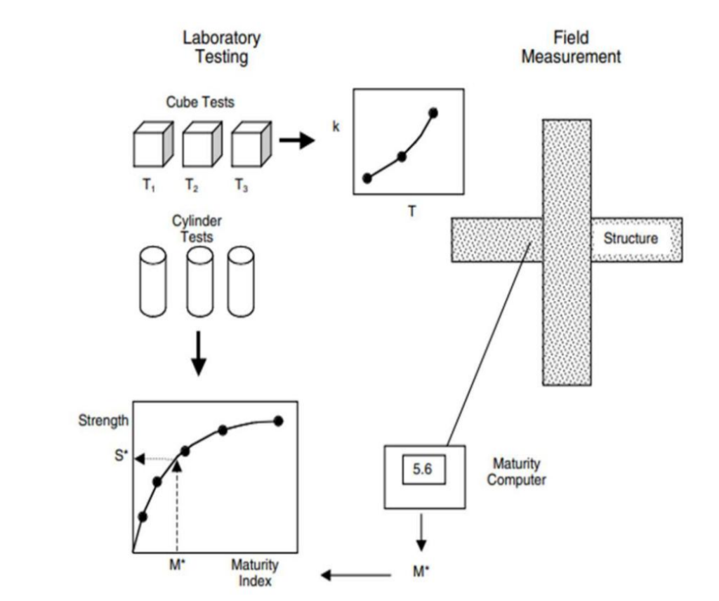 Menurut ASTM C1074, metode maturity didefinisi sebagai suatu teknik untuk memperkirakan kekuatan beton berdasarkan asumsi bahwa Sampel campuran beton tertentu mencapai kekuatan yang sama jika memiliki nilai indeks maturity yang sama. Indeks maturity merupakan area kumulatif di bawah kurva waktu – suhu yang berkembang sebagai perawatan beton. Maturity adalah metode non- destruktif yang digunakan untuk mengevaluasi perkembangan kekuatan beton in- situ secara real time. Metode maturitas ini merupakan pendekatan yang cocok untuk memprediksi pertumbuhan kekuatan awal beton dengan prinsip bahwa kekuatan beton berhubungan langsun dengan riwayat suhu hidrasi pasta semen.